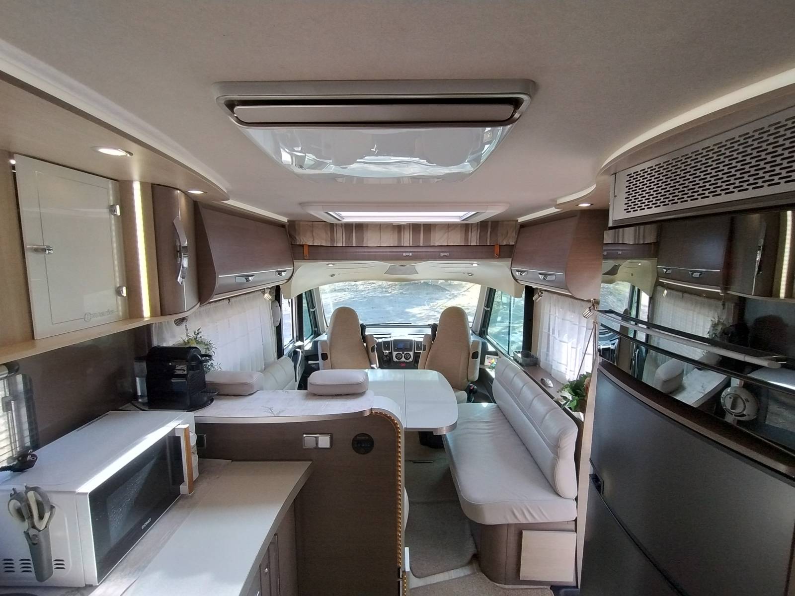 L’espace de vie se compose d’un salon très spacieux avec une grande TV escamotable. Les équipements en nombre sur ce modèle vous apporteront tout le confort attendu pour vos escapades aux long court ; climatisation cellule, batterie Lithium 200A avec convertisseur 2000W, 2 TV avec parabole automatique, etc…